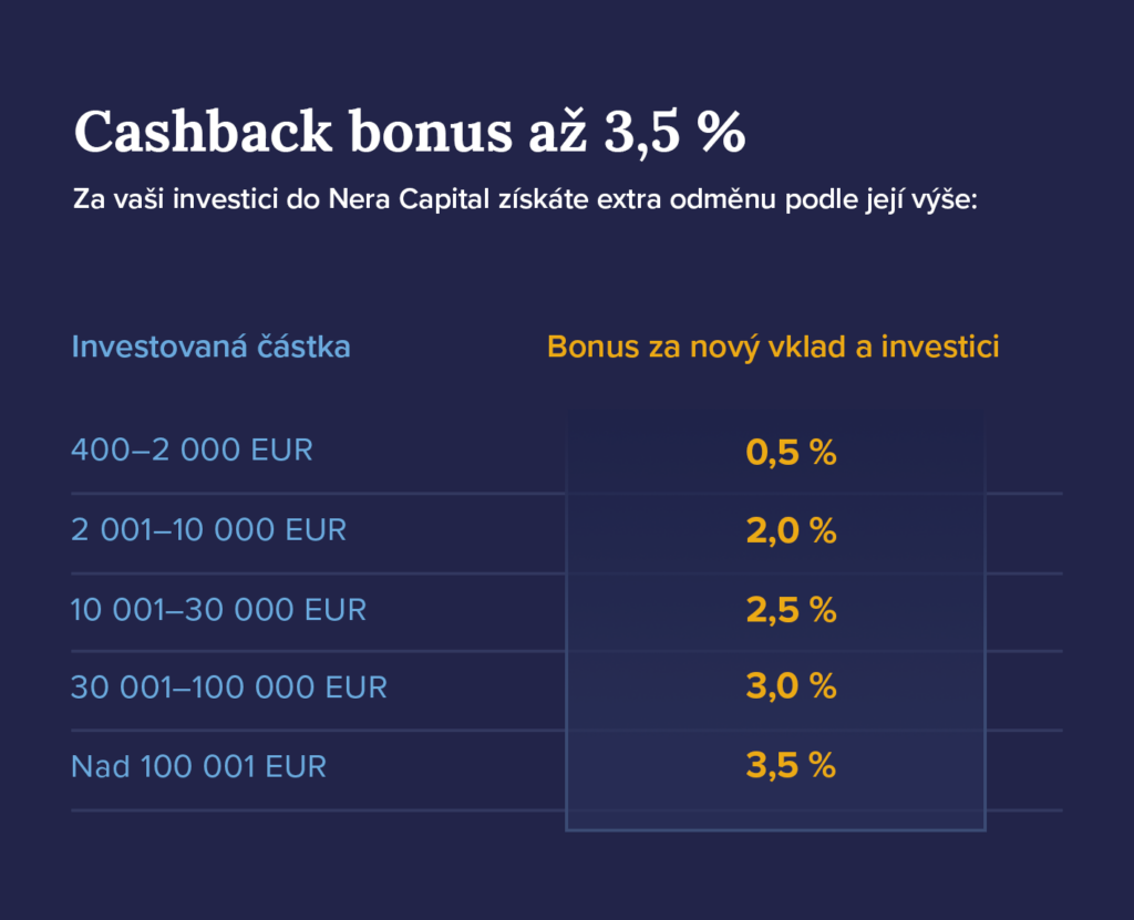 - Až 3,5 % cashback pro nové vklady (např. investice 20 000 € přináší 500 € cashback)