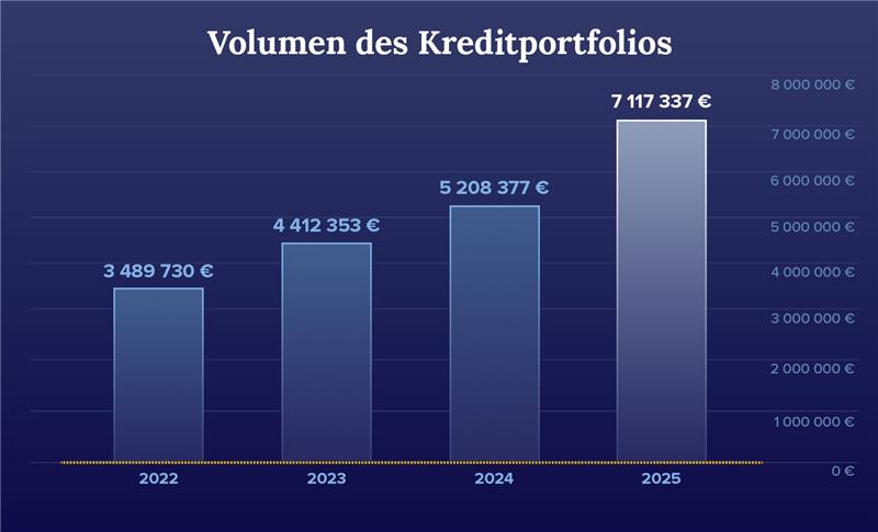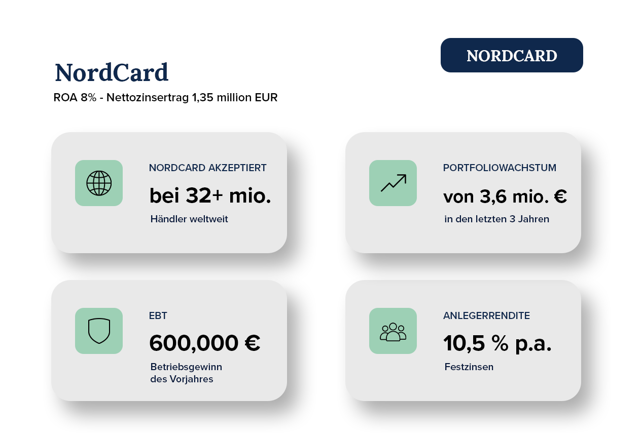 NordCard verzeichnet ein langfristiges Wachstum, was durch solide Finanzkennzahlen bestätigt wird. Das Kreditportfolio ist von rund 3,5 Millionen EUR im Jahr 2022 auf über 7,1 Millionen EUR im Jahr 2025 gewachsen. Gleichzeitig stieg der Nettozinsertrag auf über 1,35 Millionen EUR. Das Unternehmen ist profitabel – im Jahr 2025 erzielte es einen Gewinn vor Steuern (EBT) von über 600.000 EUR und verbesserte die Eigenkapitalrendite (ROA) auf über 8 %